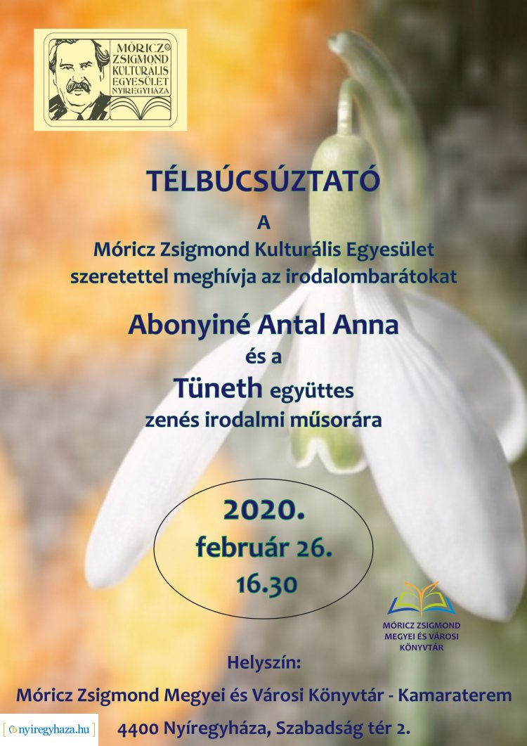 Abonyiné Antal Anna és a Tüneth együttes zenés irodalmi műsorára várják az érdeklődőket február 26-án, a Móricz Zsigmond könyvtárba.