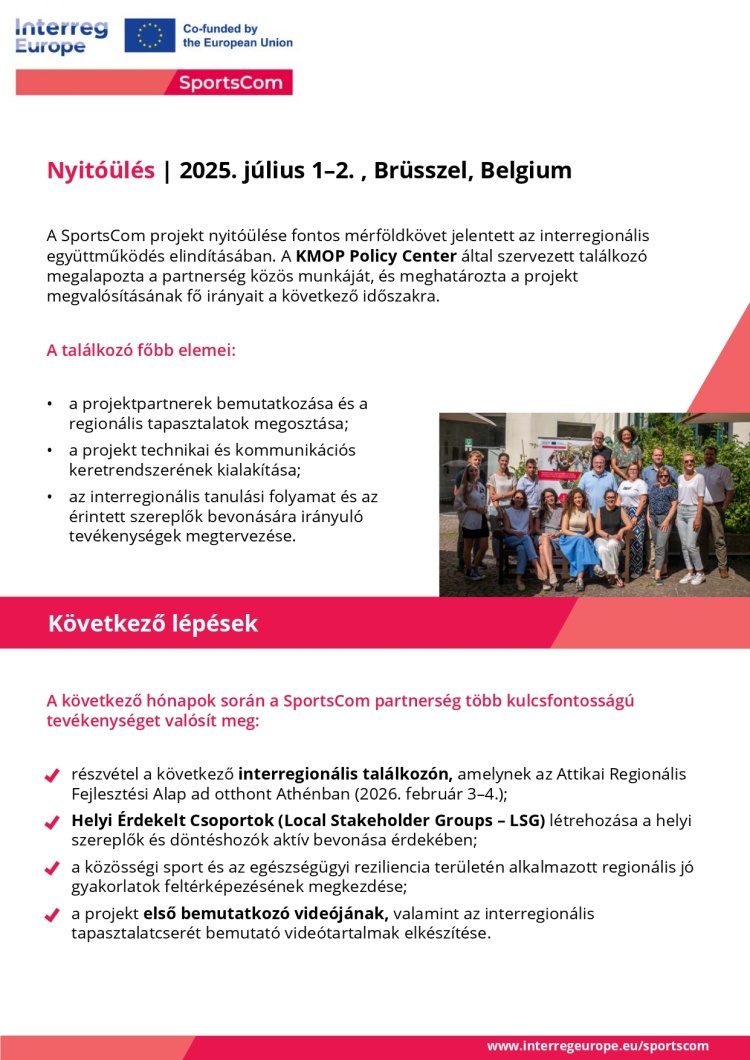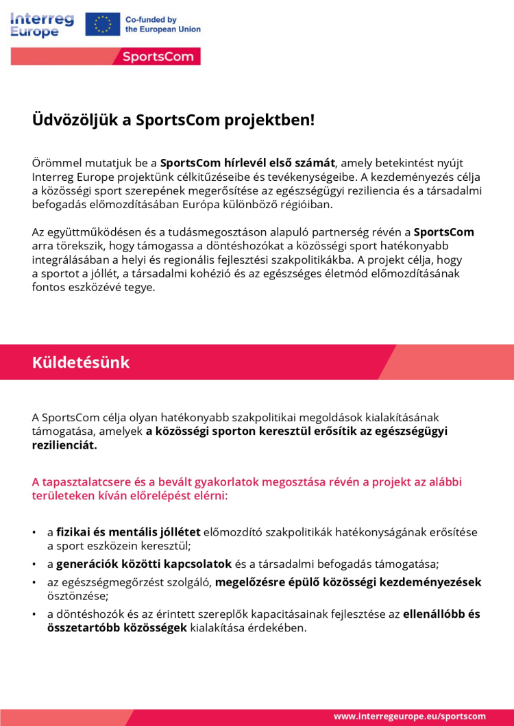 A SPORTSCOM projekt célja, hogy támogassa az európai helyi és regionális döntéshozókat a közösségi sportok kínálatának bővítésében és minőségének emelésében. Mindez hosszú távon hozzájárul a lakosság egészségügyi ellenálló képességének javításához és a társadalmi kohézió erősítéséhez. A projekt lehetőséget biztosít a partnereknek, hogy egymás tapasztalataiból és bevált gyakorlatából tanuljanak, így jobban kihasználják a közösségi sportok és az egészségügyi reziliencia kölcsönhatásaiban rejlő potenciált.