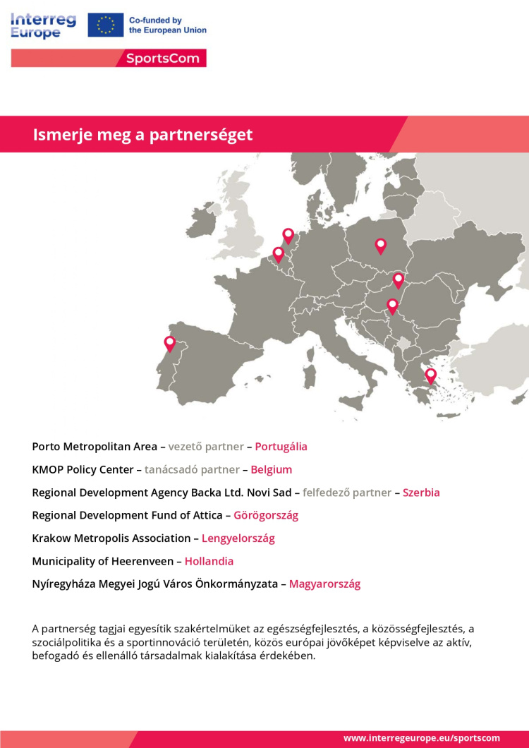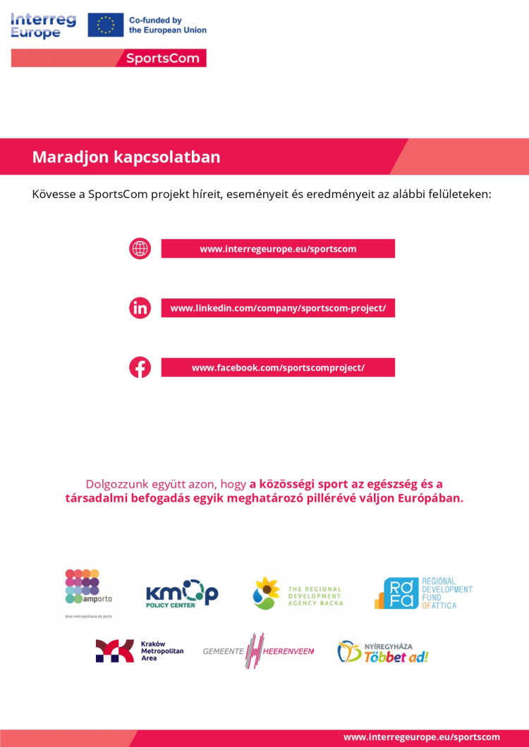 Nyíregyháza számos jógyakorlatot tud felmutatni a partnerek számára a közösségi sport céljára használható infrastruktúra kiépítésétől kezdve a közösségi sportprogramokon (pl. Mozdulj Nyíregyháza!, Bringa Piknik) át a komplex egészségügyi felmérésekig és prevencióig. Nyíregyháza Megyei Jogú Város Önkormányzata vállalta, hogy a Fenntartható Városfejlesztési Stratégia felülvizsgálata során kiemelt figyelmet fordít a közösségi sport további erősítésére a fizikai és mentális egészség javítása céljából - egyéni és közösségi szinten egyaránt.