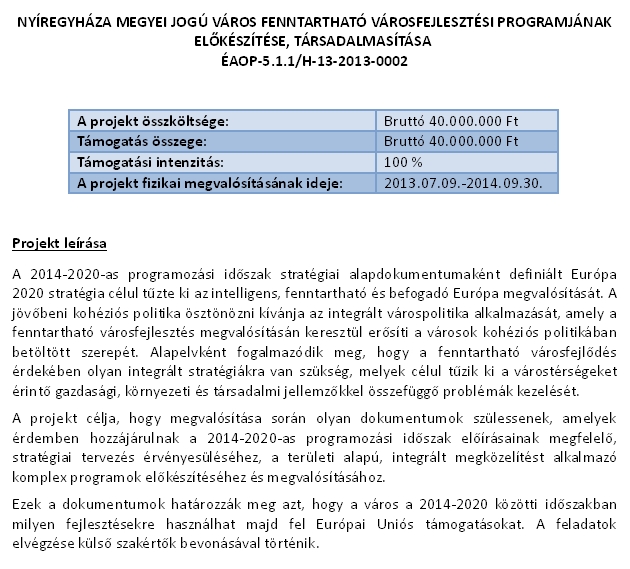 az alábbi linken megtekintheti Nyíregyháza Megyei Jogú Város 2014-2020-as időszakra vonatkozó tervezési dokumentumait: http://varoshaza.nyiregyhaza.hu/varoshaza/telepuelesrendezesi-terv/8091